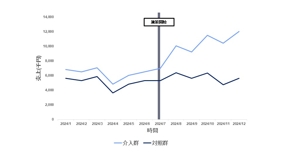 介入群を地域Aの店舗、対照群を地域Bの店舗として設定し、それぞれのグループで施策前後の売上を比較します。
