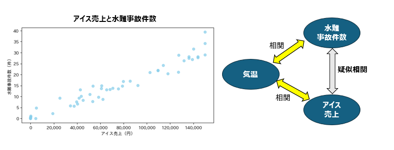 例えば、「アイスの売上」と「水難事故件数」は、どちらも「気温」が上がる夏に増加するため、見かけ上は相関関係があるように見えます。