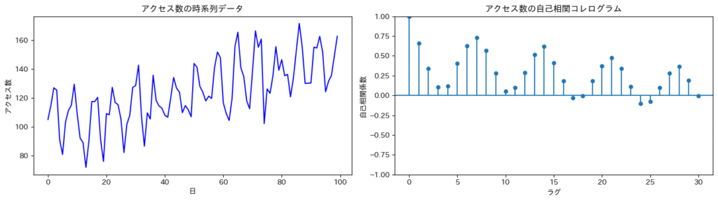 左のグラフは元の時系列データ、右のグラフは各ラグの自己相関係数を示すACFプロットです。