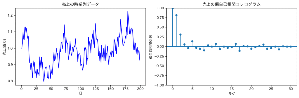 偏自己相関ではそうした間接的な影響を除外し、「1週間前の売上が今日にどれだけ直接的に影響しているか」を明らかにします。
